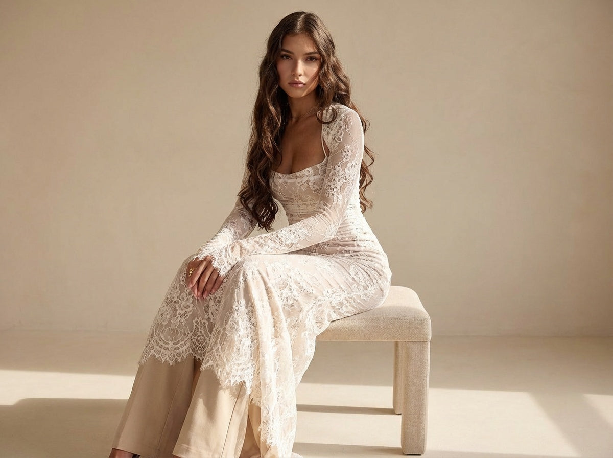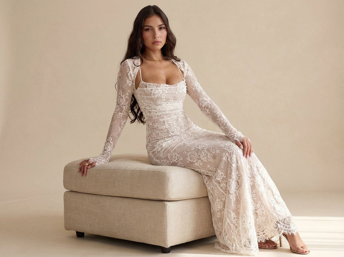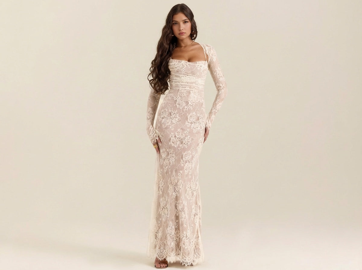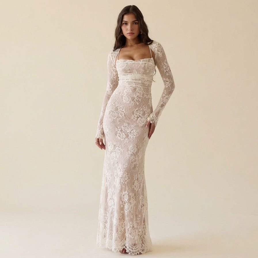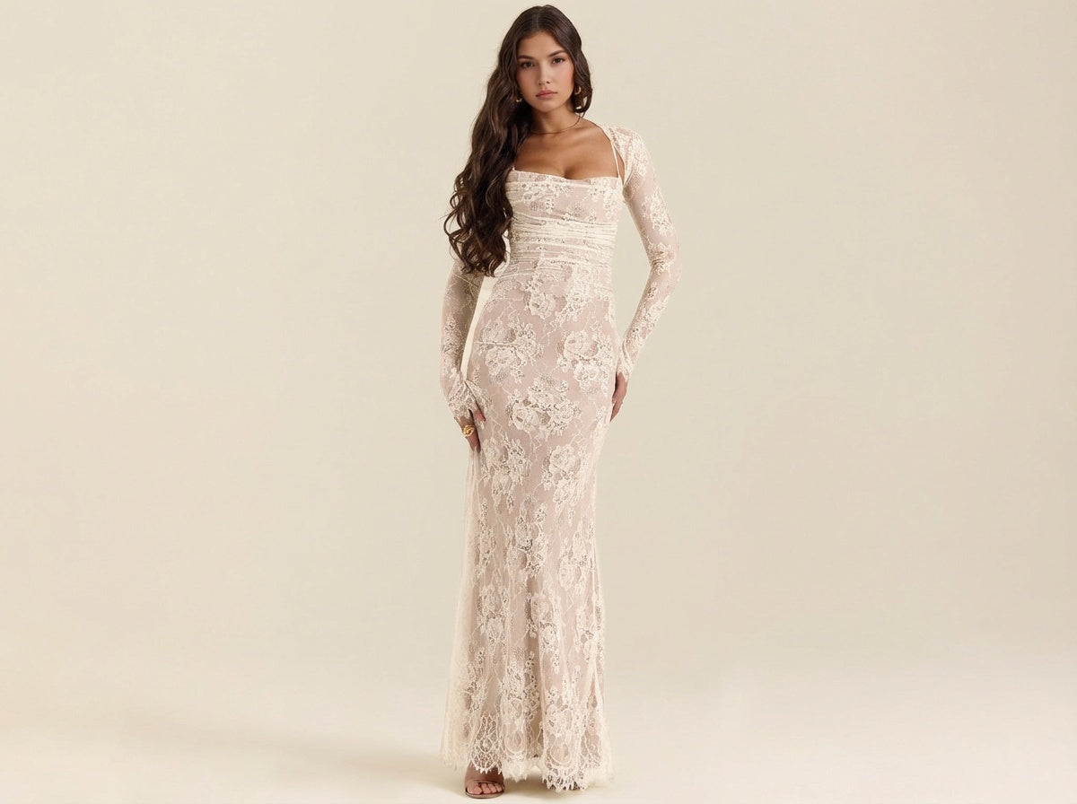 Céleste en dentelle, intemporelle dans son allure – Isolde – Robe Maxi Élégante